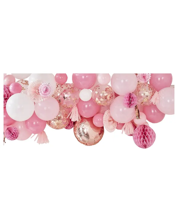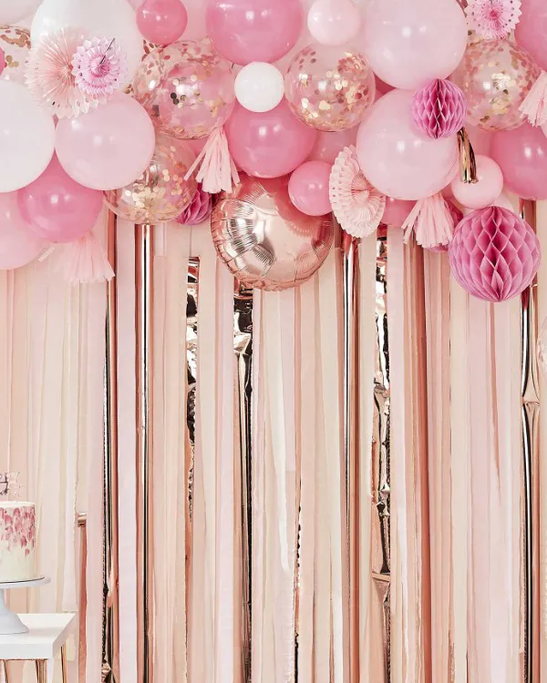 70 stykk hvite, rosa og rosegullfargede ballonger i størrelsene 12,5, 30 og 45 cm. seks hvite honeycombs, seks hvite papirfjær, åtte dusker i rosa og rosegull farge samt fire meter ballongteip, tråd, limplugger og instruksjoner på engelsk