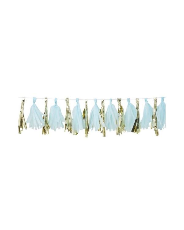 Blå og gull duskekrans – et nydelig tillegg til gullfestenes dekorasjonspakke inneholder 16 dusker. Hver pakke inneholder 2 m (L) klar snor og 16 dusker (8 blå og 8 gull) på 20 cm (H) og 6 cm (W)