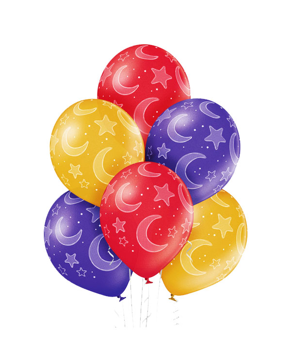 Ballongbukett med lateksballonger. Ballongene er i røde, gule og lilla med stjerner og måner på. Buketten fylles med helium og vi tar på Ultra High Float så den varer ekstra lenge. Kjempefin pynt eller gave til eid. Kommer i størrelsene liten, medium, stor og XL. Det er liten som er avbildet. I den lille er det 7 lateksballonger, 12 i medium, 16 i stor og 20 i den ekstra store. All vår dekor håndlages for hver gang, og det vil kunne oppstå varisjoner i forhold til det du ser avbildet.