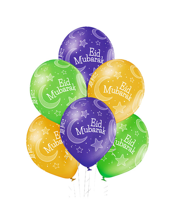 Ballongbukett med gule, lilla og grønne lateksballonger med stjerner, måner og “Eid Mubarak” på. Buketten fylles med helium og vi tar på Ultra High Float så den varer ekstra lenge. Kjempefin pynt på feiringen eller som gave. Kommer i størrelsene liten, medium, stor og XL. Det er den minste som er avbildet. I den lille er det 7 lateksballonger, 12 i medium, 16 i stor og 20 i den ekstra store. All vår dekor håndlages for hver gang, og det vil kunne oppstå varisjoner i forhold til det du ser avbildet.