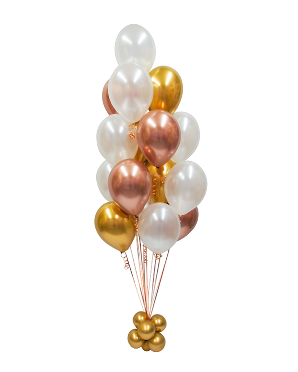 Lekker ballongbukett med lateksballonger. Buketten består lateksballonger i hvit, gull og roségull. Vi leverer ballongbuketter på døra, bestill denne flotte buketten til noen på den store dagen. Alle våre lateksballonger er nedbrytbare i naturen på lik linje med et eikeblad. Buketten kommer i størrelsene small, medium, large og XL. Det er large som er avbildet. I small er det 7, i medium er det 12, i den store er det 16 og i den største er det 20. Buketten kommer ferdig oppsatt med vekt, og oppblåst med helium. All vår dekor håndlages for hver gang, og det vil kunne oppstå varisjoner i forhold til det du ser avbildet.
