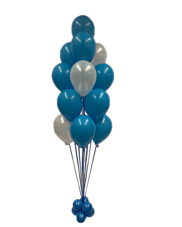 Ballongbukett med blå og hvite lateksballonger. Buketten fylles med helium og vi tar på Ultra High Float så den varer ekstra lenge. En kjempefin gave eller pynt til en bursdag, babyshower eller en annen festlig anledning. Kommer i størrelsene liten, medium, stor og XL. Det er medium som er avbildet. I den lille er det 7 lateksballonger, 12 i medium, 16 i stor og 20 i den ekstra store. All vår dekor håndlages for hver gang, og det vil kunne oppstå varisjoner i forhold til det du ser avbildet.