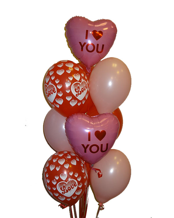 Ballongbukett med folie og lateksballonger. Buketten inneholder rosa og røde lateksballonger med romantisk tema, og hjerteformede, rosa folieballonger med “I <3 U" på. Buketten fylles med helium og vi tar på Ultra High Float så den varer ekstra lenge. En kjempefin gave eller pynt på Valentinsdagen eller en annen romantisk anledning. Kommer i størrelsene liten, medium, stor og XL. Det er den store som er avbildet. I den lille er det 4 lateksballonger og et hjerte i folie, i medium er det 6 lateksballonger og 2 hjerter i folie, i den store er det 9 lateksballonger og 2 hjerter i folie og i den største er det 13 lateksballonger og to hjerter i folie. All vår dekor håndlages for hver gang, og det vil kunne oppstå varisjoner i forhold til det du ser avbildet.