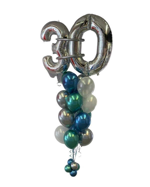 Ballongbukett med folie og lateksballonger. Buketten inneholder turkise, blå, sølvfargede og hvite lateksballonger og folietall i sølv. På bildet er det tallet 30, men du kan selv velge tall som passer din jubilant. Buketten fylles med helium og vi tar på Ultra High Float på lateksballongene så buketten varer ekstra lenge. Perfekt pynt på bursdagsfeiringen eller som gave til jubilanten. Kommer i størrelsene liten, medium, stor, XL og XXL. Det er den største som er avbildet. I den lille er det 3 lateksballonger og 2 folietall, i medium er det 6 lateksballonger og 2 folietall, i den store er det 9 lateksballonger og 2 folietall, i XL er det 12 lateksballonger og 2 folietall og i XXL er det 16 lateksballonger og 2 folietall. All vår dekor håndlages for hver gang, og det vil kunne oppstå varisjoner i forhold til det du ser avbildet.