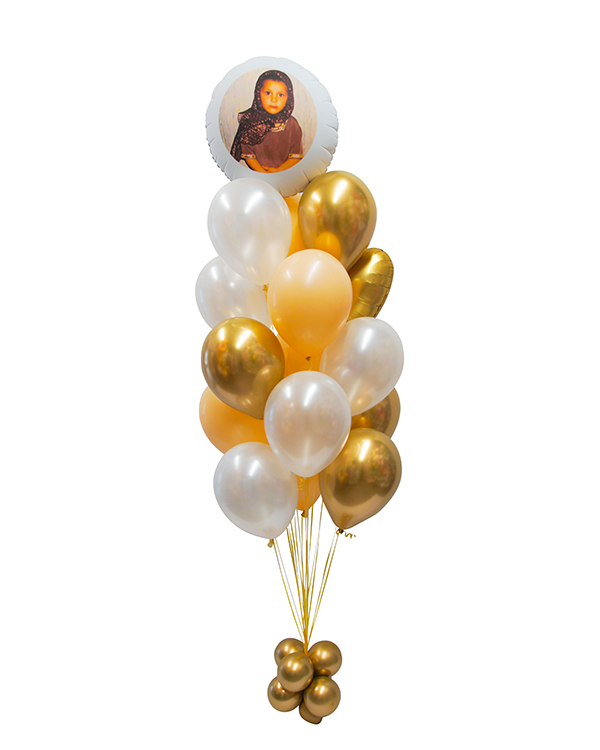 Spesiell ballongbukett med lateks og folieballonger. Buketten består av gullfargede, hvite og nude lateksballonger, hjerteformede gullfaregde folieballonger og en folieballong med valgfritt bilde på. Vi leverer ballongbuketter på døra, og denne flotte buketten er en perfekt gave til den store dagen. Send oss et bilde og vi printer det på balllongen så den blir ekstra personlig. Buketten kommer i størrelsene small, medium, large og XL. Det er den største som er avbildet. I den lille er det 3 lateksballonger og 1 bildeballong, i medium er det 6 lateksballonger, 1 hjerteformet folieballong og 1 bildeballong, i den store er det 12 lateksballonger 1 hjerteformet folieballong og 1 bildeballong og i den største er det 18 lateksballonger 1 hjerteformet folieballong og 1 bildeballong. Buketten kommer ferdig oppsatt med vekt, og oppblåst med helium. All vår dekor håndlages for hver gang, og det vil kunne oppstå varisjoner i forhold til det du ser avbildet.