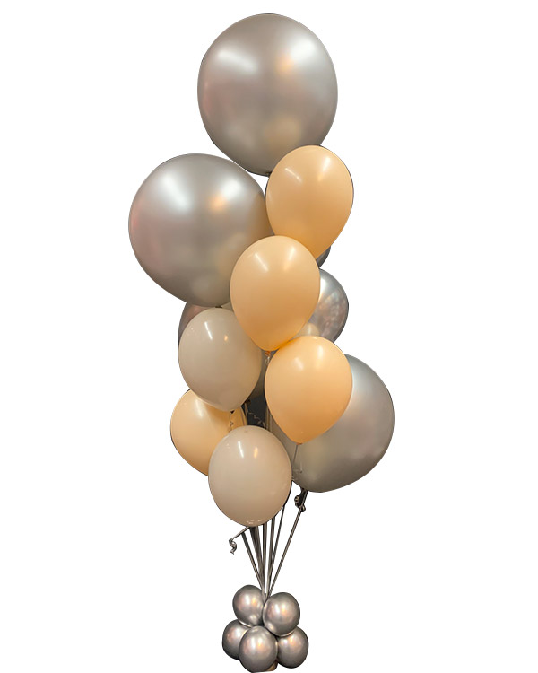 Lekker ballongbukett med folie og lateksballonger. Buketten inneholder lateksballonger i sølv, nude og hvit og jumboballonger i sølv på 60 cm. Buketten fylles med helium og vi tar på Ultra High Float på lateksballongene så buketten varer ekstra lenge. Perfekt pynt i et bryllup, en fancy fest, eller bare en anledning som trenger litt ekstra stas. Kommer i størrelsene liten, medium, stor, XL og XXL. Det er XXL som er avbildet. I den lille er det 3 lateksballonger og 1 jumboballong (60cm) i medium er det 8 lateksballonger og 1 jumboballong (60cm), i den store er det 6 lateksballonger og 2 jumboballonger (60cm), i XL er det 8 lateksballonger og 3 jumboballonger (60cm) og i den største er det 8 lateksballonger og 4 jumboballonger (60cm). All vår dekor håndlages for hver gang, og det vil kunne oppstå varisjoner i forhold til det du ser avbildet.
