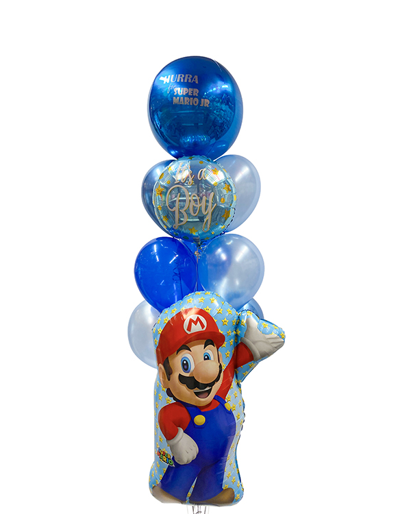 Ballongbukett med lateks og folieballonger. Buketten inneholder lateksballonger i ulike blåfarger, en blå, stor orbz og en Super Mario folieballong. Vi leverer ballongbuketter på døra, bestill denne flotte buketten til noen som har bursdag. Du kan printe valgfri tekst på den store orbz-ballongen. Buketten kommer i størrelsene small, medium, large og XL. Det er den største som er avbildet. I den lille er det 4 lateksballonger og 1 stor Super Mario folieballong, i medium er det 7 lateks og 1 stor folie, i den store er det 7 lateks, 1 orbz og 1 stor folie og i den største er det 7 lateksballonger, 1 orbz, 1 liten folieballong og 1 stor Super Mario folieballong. Buketten kommer ferdig oppsatt med vekt, og oppblåst med helium. All vår dekor håndlages for hver gang, og det vil kunne oppstå varisjoner i forhold til det du ser avbildet.