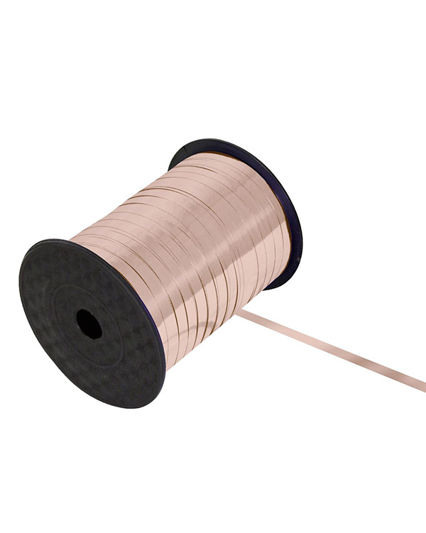 1 stk. 230m x 5mm bånd i rosegull metallisk farge. Kan brukes som bånd til ballongbuketter og pakker.