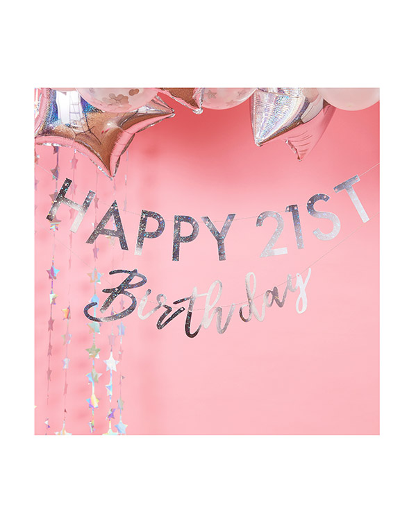 1 stk. Girlander med iriserende sølvfarge og teksten “Happy Birthday”. Girlanderen kommer med tall 0-9 (2stk av hver), slik at du kan personliggjøre den for Din anledning. Sett stas på bursdagen og dekorer festlokalet med dette banneret når dere skal feire. Girlanderet kommer på to snorer, og kan henges opp på alle typer vegger. Hver pakke består av 2 x 1,75 m L-tråder og 2 stk av hvert nummer mellom 0 og 9 for å tilpasse og ‘RD’ ‘TH’ og ‘ND’ bokstaver.