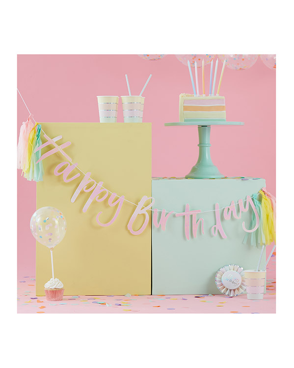 1 stk. Rosa girlander med teksten “Happy Birthday”, du får også med tassels i forskjellige farger med på kjøpet. Passer perfekt til bursdagsfest som dekor i festlokalet, eller gave til bursdagsbarnet. Girlanderet er 2m langt.