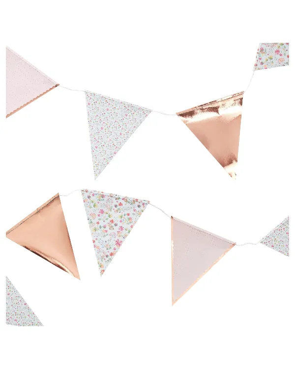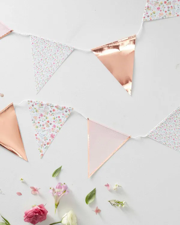 Skap en festlig atmosfære med denne vakre banneren / girlanderen! Den er perfekt for enhver anledning, enten det er bursdagsfeiring, bryllup eller en annen festlig begivenhet. Vimplene har et nydelig blomstermønster som gir en feminin og elegant touch. Den metalliske og prikkete designen legger til en ekstra glans og festlig stemning.