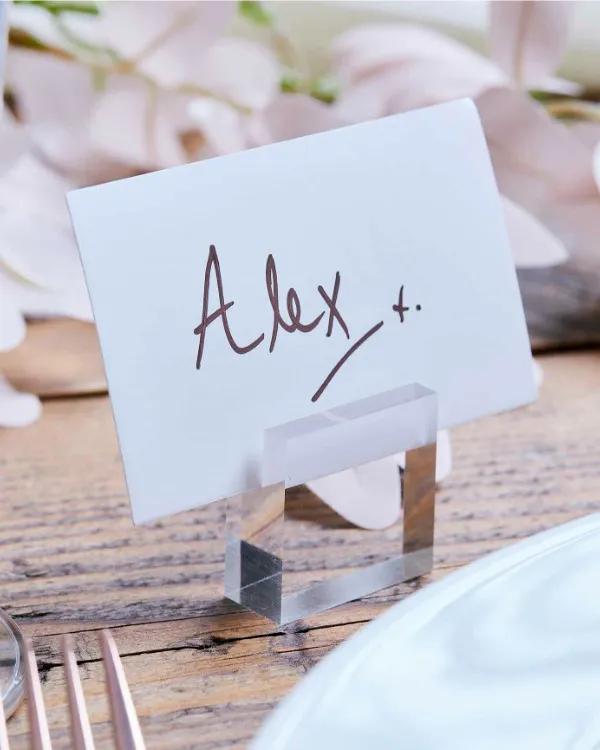 Denne bordkort holderen er laget av klar akryl og er gjennomsiktig. Den har målene 3cm i høyde, 3cm i bredde og 1,5cm i dybde. Denne praktiske og stilige holderen er perfekt for å vise frem bordkortene på en elegant måte. Den passer til enhver anledning, enten det er bryllup, bursdag eller andre festlige arrangementer. Med denne bordkort holderen kan du enkelt organisere gjestenes plassering og legge til en fin touch på borddekorasjonen. Kjøp denne bordkort holderen i dag og gjør ditt neste arrangement enda mer spesielt!