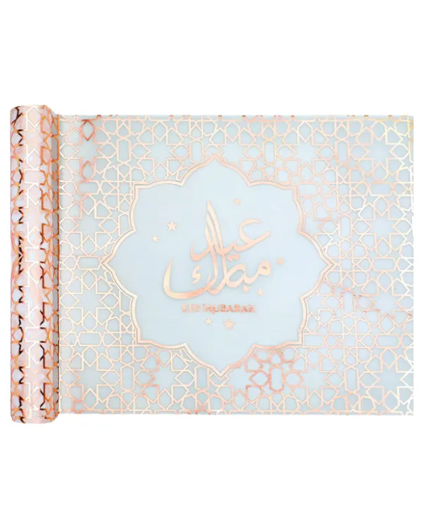 Skap en unik og festlig atmosfære under Eid-feiringen med vår vakre bordløper i «Eid Mubarak» design. Bordløperen er fargen rose gull og måler 5 meter i lengden og 30 cm i bredden.