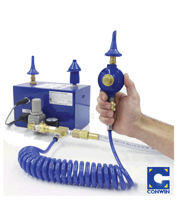 The Digital Inflator 10ft Extension Hose festes bakpå the Dual Split-Second Sizer or Duplicator 2 og gjør så du kan blåse opp ballongene dine opptil 3 meter unna.
