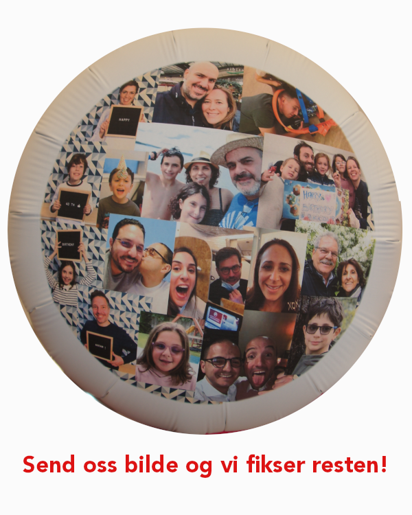 Send oss bilde du ønsker på ballongen, så blir dette printet på, om du ønsker bildekollasj som på eksempelbilde, må dette lages selv og sende dette til oss. Om du ønsker at vi skal lage dette for deg, så legge dette til som et tilleggsprodukt. Dette koster 150,- ekstra.