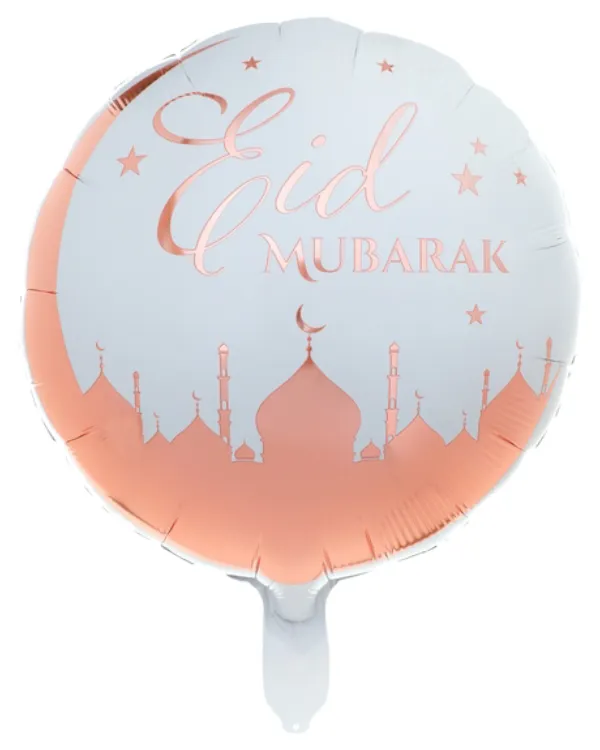 Denne vakre folieballongen er perfekt for å feire Eid Mubarak. Ballongen har en elegant rosegullfarge og er 45 cm i størrelse. Den er laget av høykvalitets foliemateriale som gjør den holdbar og langvarig. Med sitt festlige design og teksten “Eid Mubarak” vil denne ballongen legge til en ekstra touch av glede og feiring til enhver Eid-arrangement. Heng den opp som dekorasjon eller gi den som en gave til noen spesielle. Skap minner og spre glede med denne fantastiske folieballongen.
