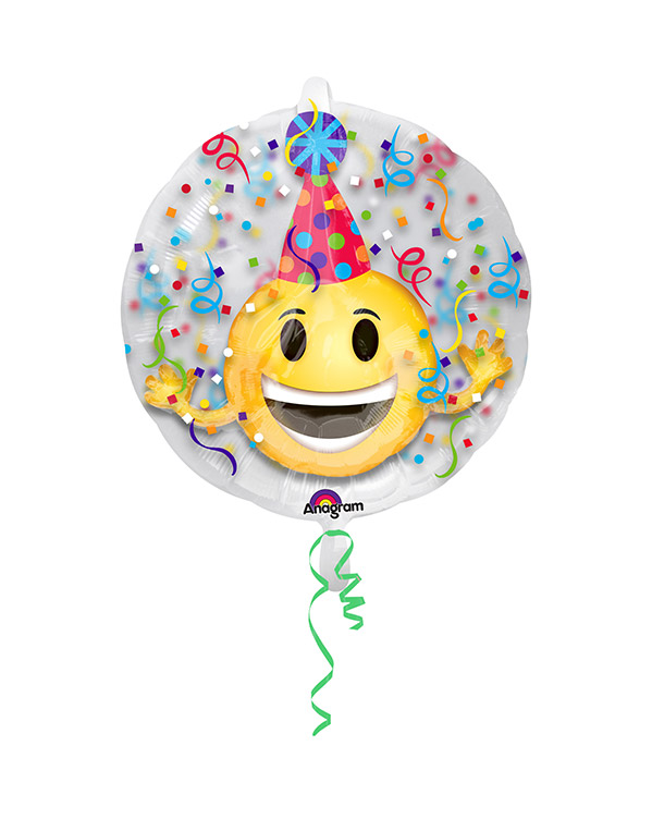 1 stk rund folieballong på 60cm. Ballongen har bilde av en glisende smiley med festhatt som danser i konfetti. Bruk den som pynt på en fest hvor du vil at folk skal ha det ekstra gøy. Kan fylles med helium eller luft. Bruk gjerne en ballongvekt så ballongen ikke flyr sin vei.