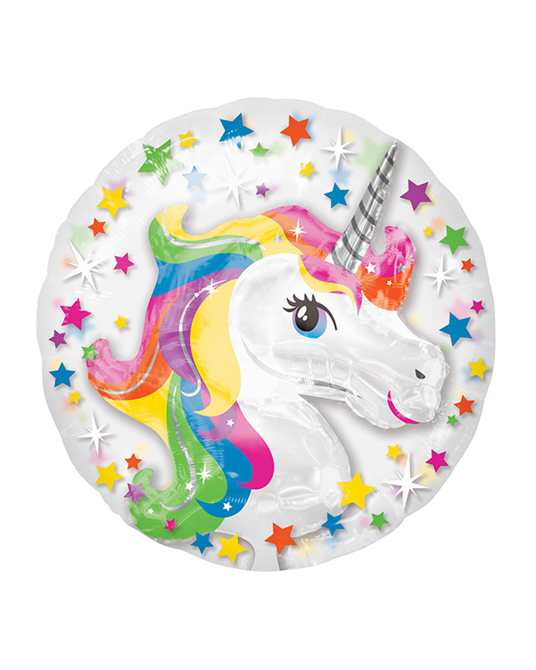 1 stk rund folieballong på 60 cm. Ballongen bilde av en enhjørning med regnbuefarget man, omringet av stjerner i ulike farger. Denne eventyrlige og lekne ballongen passer perfekt som pynt på bursdagsfest. Kan fylles med helium eller luft. Bruk gjerne en ballongvekt så ballongen ikke flyr sin vei.