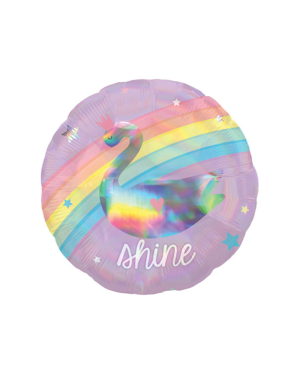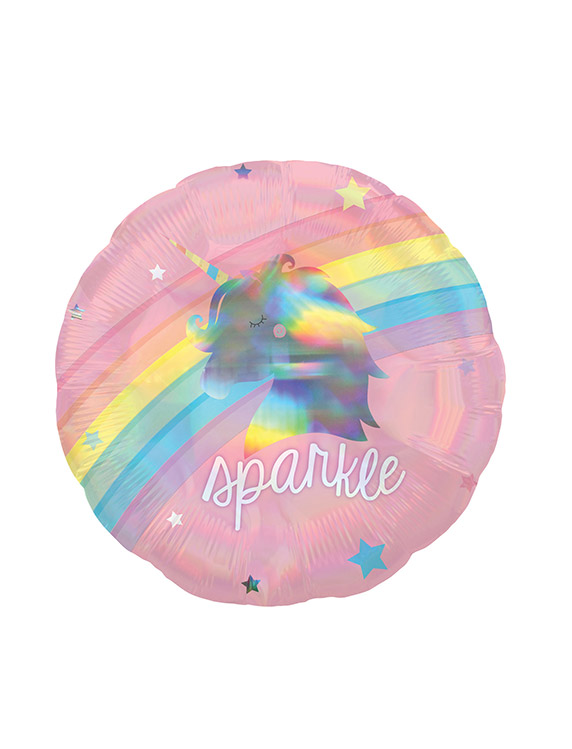 1 stk rund folieballong på 43 cm. Ballongen er rosa, med bilde av en regnbue og en enhjørning i holografiske farger. Den har også teksten «Sparkle» i glitrende farger. Gi ballongen til en som fortjener å skinne litt ekstra, eller bruk den som pynt. Kan fylles med helium eller luft. Bruk gjerne en ballongvekt så ballongen ikke flyr sin vei.