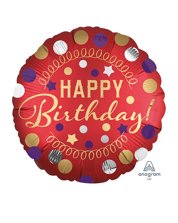 1 stk rund folieballong på 43 cm. Ballongen er rød med prikker i sølv, gull og lilla med teksten “Happy Birthday” i gull. Perfekt gave til bursdagsbarnet eller pynt til festen. Kan fylles med helium eller luft. Bruk gjerne en ballongvekt så ballongen ikke flyr sin vei