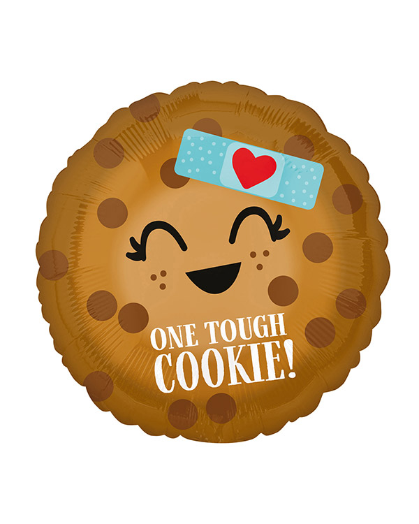 1 stk rund folieballong på 71 cm. Denne ballongen er en kjeks som smiler med et plaster og teksten “One Tough Cookie”. Kjenner du noen som har vært gjennom noe tungt og trenger en oppmuntring? Da er denne ballongen midt i blinken. Kan fylles med luft eller helium. Bruk gjerne en ballongvekt så den ikke flyr sin vei.