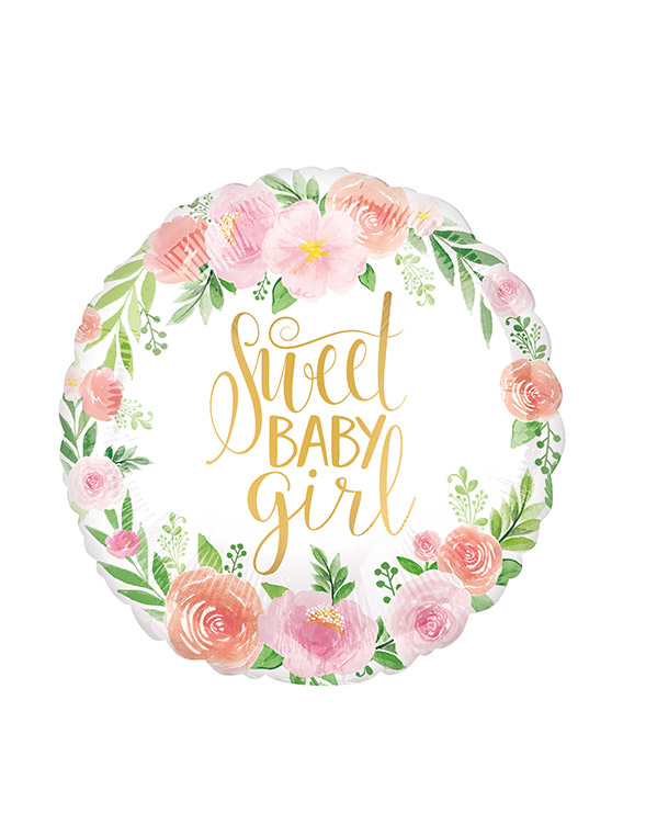 1 stk rund folieballong 45 cm. Ballongen er hvit med blomster i delikate farger rundt kanten og teksten «Sweet Baby Girl» i gull. Gi ballongen som en gave til de nybakte foreldrene, eller bruk den som pynt på babyshower. Kan fylles med luft eller helium. Bruk gjerne en ballongvekt så den ikke flyr sin vei.