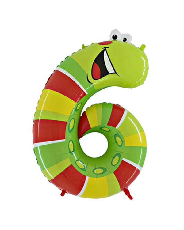 1. Stk folieballong med en morsom larvefigur formet med tallet “6”. Ballongen kan bli opptil 101,6cm stor når den blåses opp. Passer perfekt til bursdager og temafester for yngre barn. Kan fylles med luft eller helium. Bruk gjerne en ballongvekt så den ikke flyr sin vei.