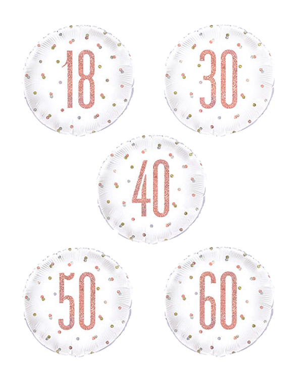 1 stk rund folieballong på 45 cm. Ballongen er hvit med roségullfarget, glitrende konfetti og tall i midten. Kommer i tallene 13, 16, 18, 21, 30, 40, 50, 60, 70, 80, 90 og 100. Velg ballongen som passer din jubilant og gjør deg klar for fest. Kan settes sammen med andre ballonger for å lage en lekker ballongbukett. fest den gjerne på en ballongvekt så den ikke flyr sin vei. Ballongen kan fylles med luft eller helium.
