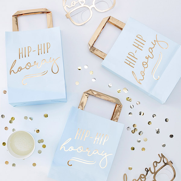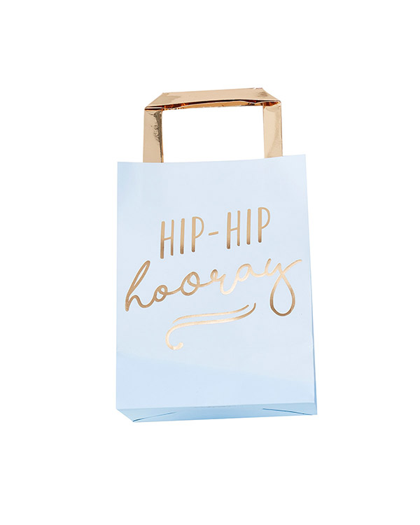 Disse vakre pastellblå festposene er ypperlige til bursdagsfester og spesielle feiringer! Den søte Hip-Hip Hooray-designen er foliert i gull med matchende gullhåndtak.