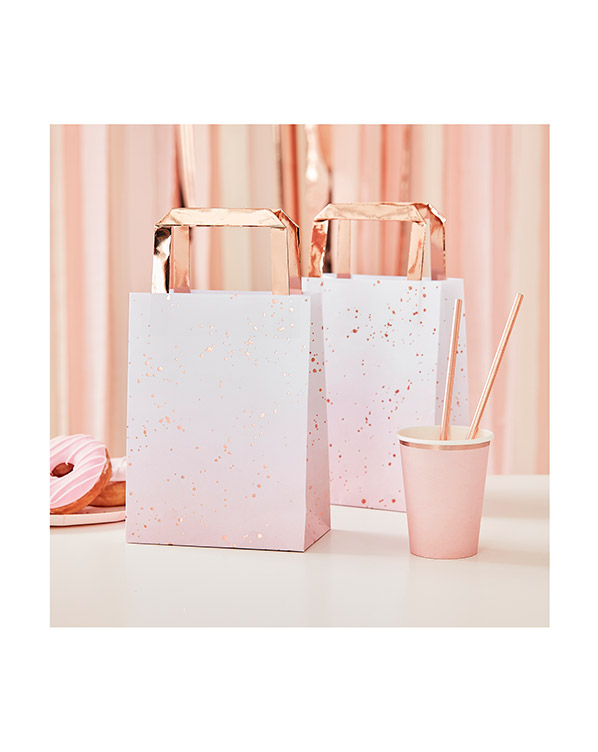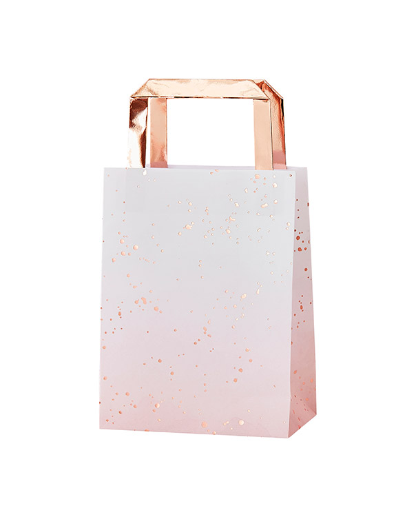 5 stk. Gaveposer med rosegull bakgrunnsfarge og rosa/gullfargede prikker. Passer perfekt til lanseringsfester og andre festlige anledninger hvor du ønsker å gi bort “giveaways”. Gaveposene måles 27 x 17cm i størrelse.
