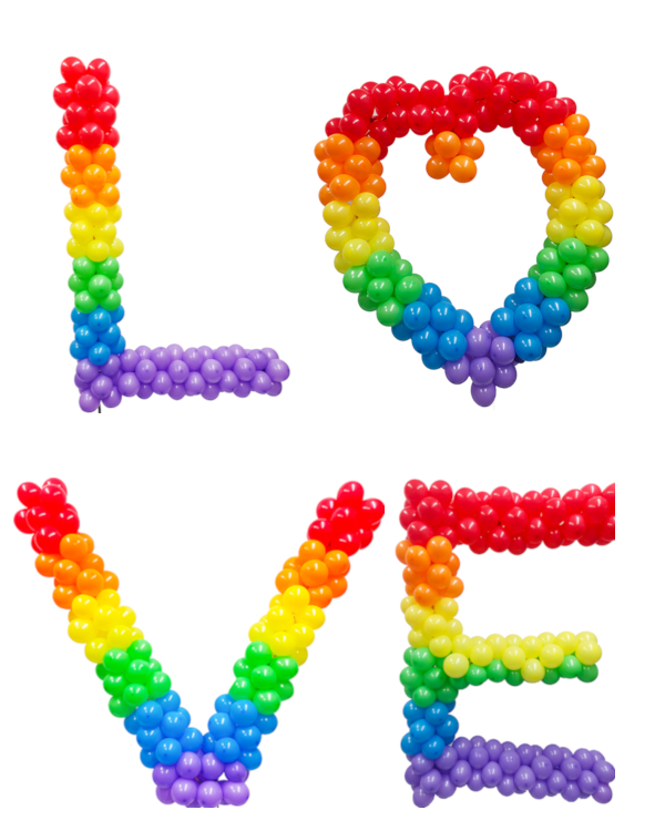Store bokstaver på 1,5 meter lagd av mange små ballonger. I dette tilfellet har vi skrevet “LOVE” i regnbuens farger, perfekt til Pridefeiringen! Kan også bestilles med andre bokstaver og andre farger. Kan brukes til en butikkåpning, eller kanskje en romantisk gest? Skriv hva du ønsker, så fikser vi det. All vår dekor håndlages for hver gang, og det vil kunne oppstå varisjoner i forhold til det du ser avbildet.