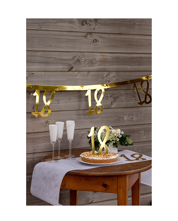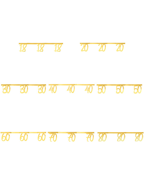Girlander/banner på 250 cm. Banneret er i gull og med tall bortover hele. Kommer i tallene 18, 20, 30, 40, 50, 60, 70 og 80. Velg ut banneret som passer din jubilant og bruk det som pynt på feiringen. Vi har gullkopper og gulltallerkener som matcher hvis du vil ha et gjennomført tema.