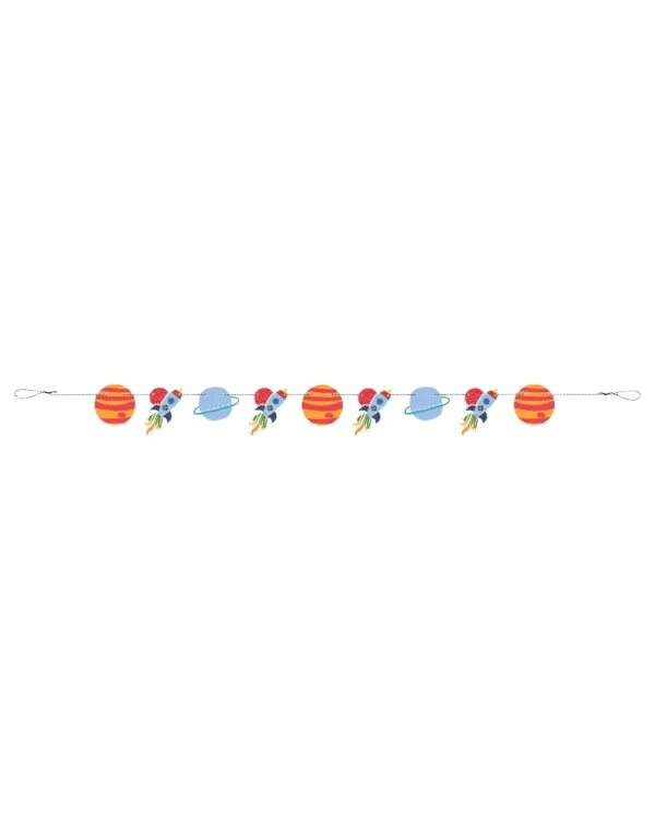 Denne fantastiske girlanderen med planeter og raketter er perfekt for å skape en magisk atmosfære på bursdagsfesten eller romtema-arrangementet ditt. Med en lengde på 150 cm vil denne girlanderen definitivt bli et iøynefallende element i rommet.