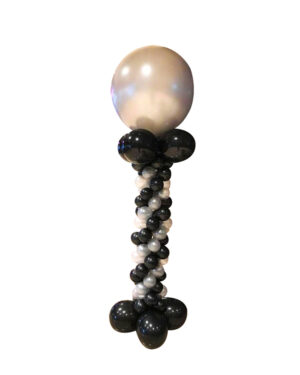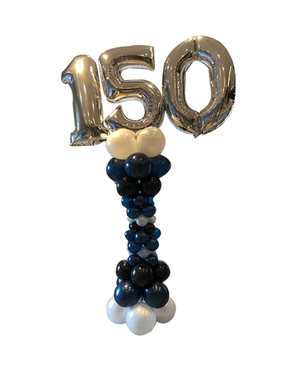 Lekker ballongsøyle med svarte, hvite og blå ballonger. Søylen er lagd av lateksballonger med folieballonger i sølv i tallet «150». Fylles med luft. Perfekt dekorasjon utenfor en fest, en grand opening eller noe lignende hvor du trenger litt ekstra pynt. Vi kan også lage andre Ballongsøyler på forespørsel. All vår dekor håndlages for hver gang, og det vil kunne oppstå varisjoner i forhold til det du ser avbildet.