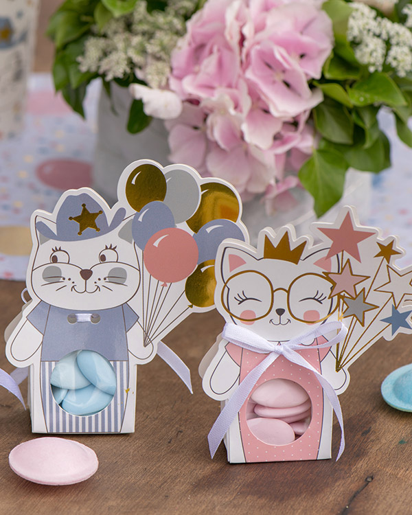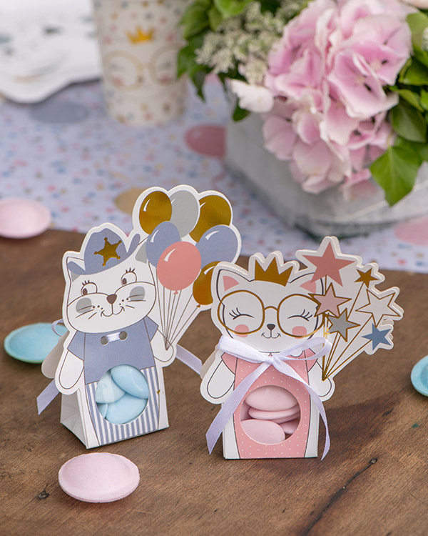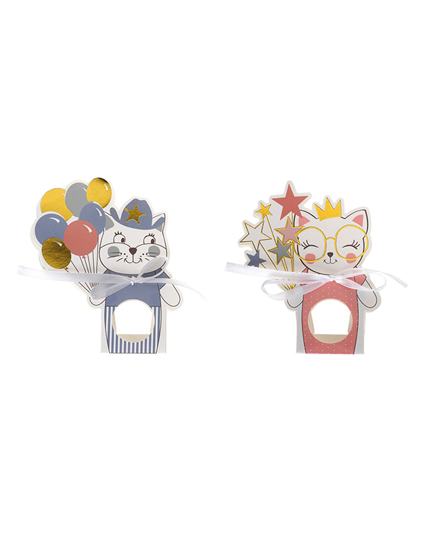 Godteekse med kattemotiv. Disse søte eskene kommer som en rosa katt som holder en bukett med stjerner og en blå katt som holder en bukett med ballonger. Fyll eskene med godteri og del de ut i barnebursdagen, vi lover det kommer til å bli satt pris på. Vi har også tallerkener og kopper med samme kattemotiv for en gjennomført bursdagsfeiring.