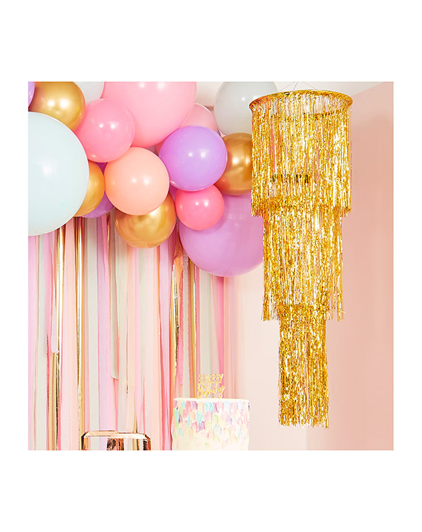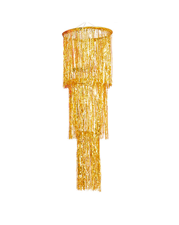 Stor, hengende gulldekorasjon formet som en lysekrone. Lyskronen er 1,3 meter med tassels i glitrende gull. Heng den opp i midten av festen for å gjør festen ekstra staselig.