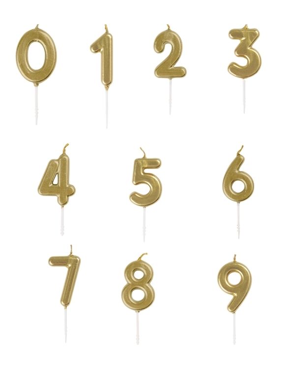 Små, gullfargede kakelys på 7,6 cm. Kommer i tallene 0, 1, 2, 3, 4, 5, 6, 7, 8 og 9. Bruk de alene eller kombiner to (kanskje til og med tre!) for det passende tallet. Morsomt på kaken til jubilanten for å gjøre dagen ekstra spesiell.