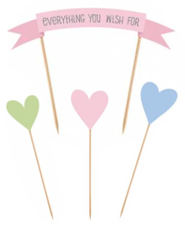 Dette settet inkluderer 4 delikate topper perfekt for en pastel-themed fest. Settet består av 3 hjerter i pastellfarger (blå, rosa, grønn) og 1 banner i rosa med teksten “Everything you wish for”. Hjerte-toppene måler mellom 13,5 og 20,5 cm og gir en søt og elegant dekorasjon til kaken. Banneret, med den inspirerende hilsenen på engelsk, setter en personlig og festlig touch. Dette settet er ideelt for babyshowers, dåp eller enhver pastel-themed feiring, og tilfører en unik og vakker detalj til kakeoppsettet ditt.