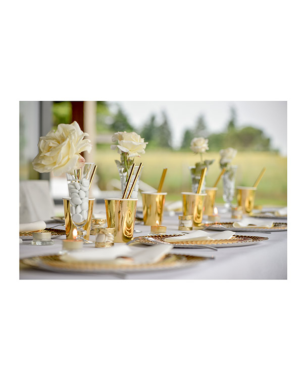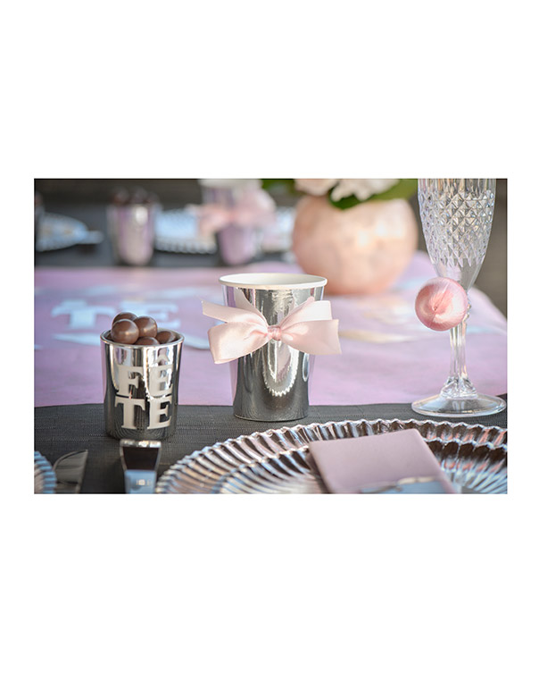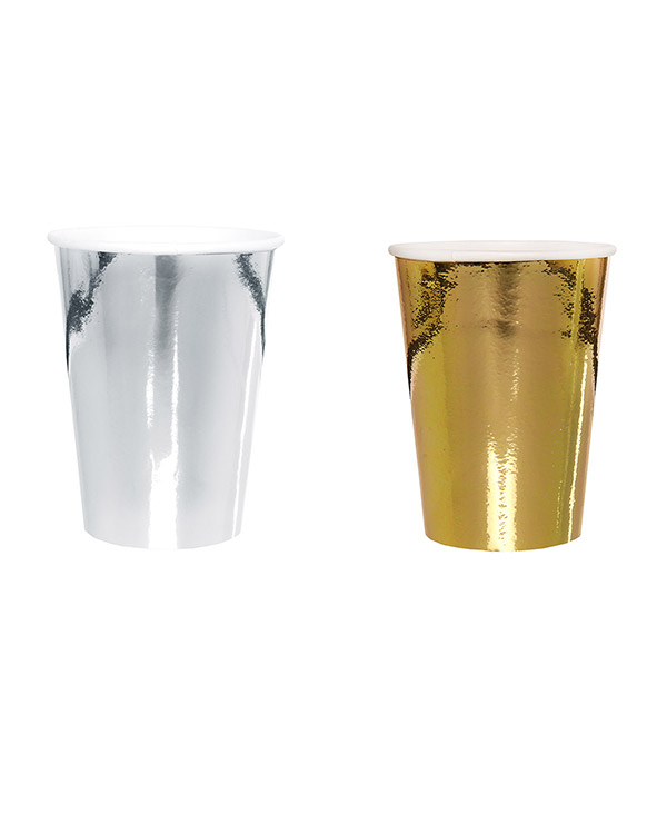 10 stk pappkopper i skinnende sølv eller gull. Fin pynt på for eksempel nyttårsaften. Vi har tallerkener i matchende farger hvis dere vil ha en gjennomført tema. Størrelsen på koppene er 9,7 cm.