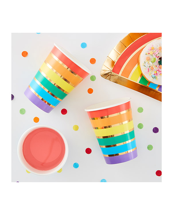 8 stk pappkopper i gull med regnbuefargede striper. Perfekt pynt til alle anledninger. kan brukes til å dekorere til en Pridefest for eksempel. Vi har også masse annet med regnbuemotiv hvis dere ønsker et gjennomført tema. Størrelsen på koppene er 7,5 x 9 cm.