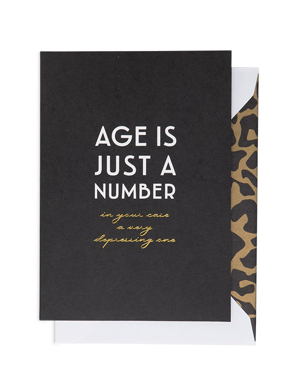 1 stk. Kort med teksten “Age is just a number”. Kortet har en svart bakgrunnsfarge med hvit tekst. Kommer i A6 størrelse. Morsom tekst som garantert vil bli tatt godt i mot når du gir det til noen du er glad i.