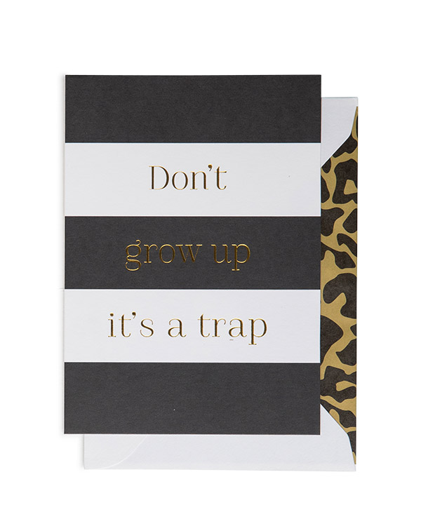 1 stk. Gavekort med sort og hvit bakgrunnsfarge. Kommer med teksten “Don’t grow up it’s a trap”. Morsomt kort som passer til folk fra tenårene og oppover. Kommer i A6 størrelse.