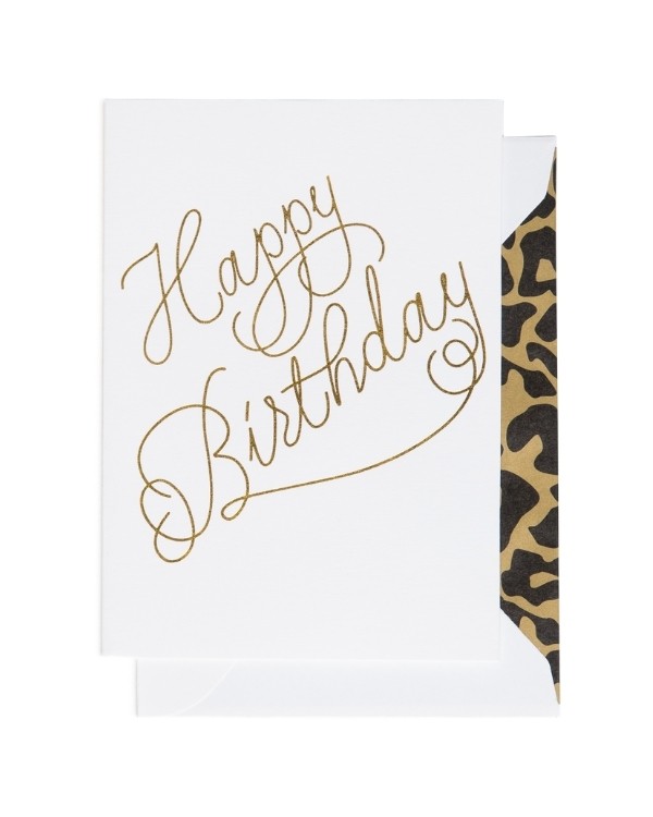 Kort med teksten “Happy Birthday”. Kortet har en hvit bakgrunnsfarge med gullfarget tekst. Kommer i A6 størrelse. Kult bursdagskort som du kan overraske en venn med.