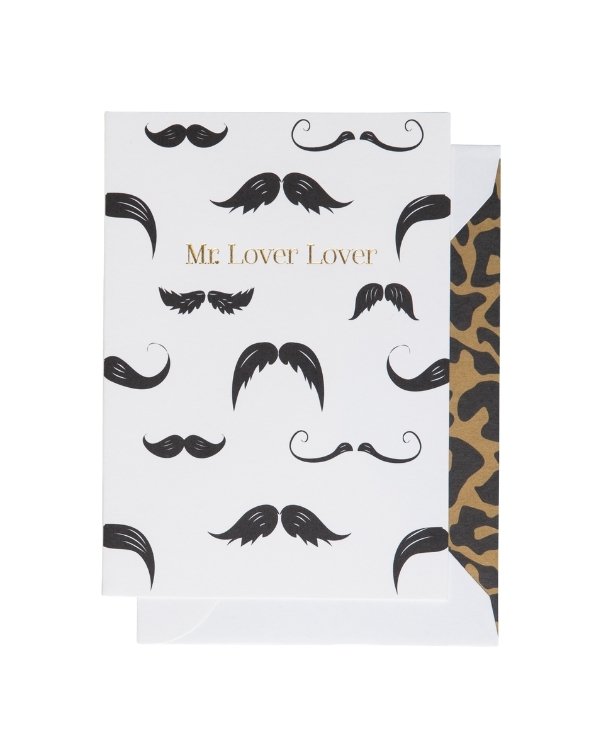 Kort med teksten “Mr. Lover Lover”. Kortet har en sort bakgrunnsfarge med gullfarget tekst. Kommer i A6 størrelse. Morsomt kort man kan gi bort til både kjærester og partnere.