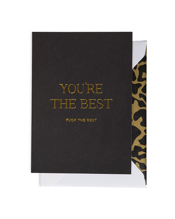1 stk. Kort med teksten “You’re the best fuck the rest”. Kortet har en sort bakgrunnsfarge, med gullfarget tekst. Kommer i A6 størrelse. Perfekt kort til noen du virkelig er glad i.
