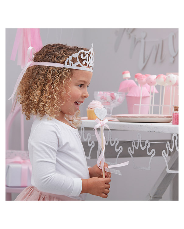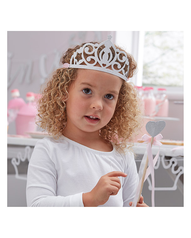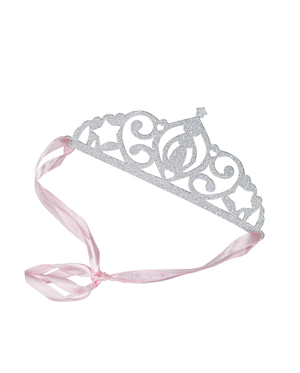 5 stk sølvglitrende tiaraer med rosa silkebånd til å feste de. Perfekt til prinsessebursdag, utdrikningslag eller andre festligheter. Tiaraen er 19 x 9 cm.