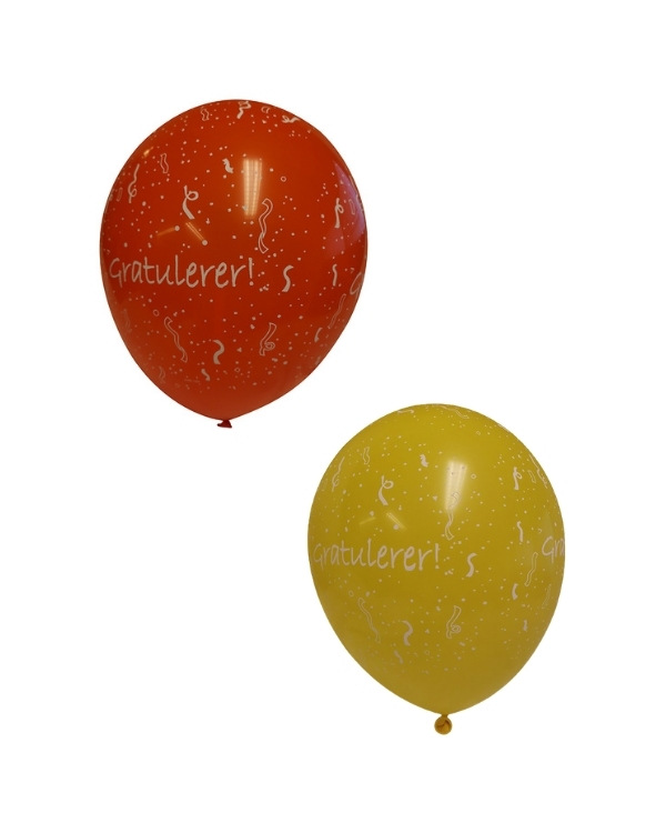 Lateksballong på 28 cm med teksten “Gratulerer”. Ballongen er finnes i fargene oransje og gul. Fyll de med luft eller helium. Kjøp med Ultra High Float du kan smøre i ballongen så den varer ekstra lenger. Vi anbefaler også å kjøpe en ballongvekt så den holder seg på samme sted hele kvelden. Alle våre lateksballonger er nedbrytbare i naturen på lik linje med et eikeblad.