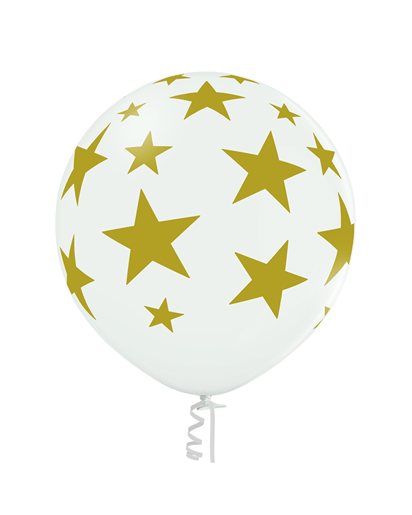2 stk lateksballonger med gullstjerner og hvit bakgrunnsfarge i pastell. Ballongene kan bli opptil 60cm store når de blåses opp. Fine ballonger som passer til festlige anledninger. Alle våre lateksballonger er nedbrytbare i naturen på lik linje med eksempelvis eikeblader.