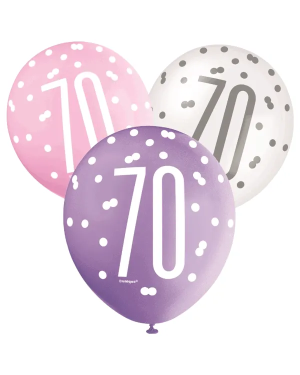 Lateksballonger (5stk): “70” – med prikker – Rosa & Hvite – 30cm