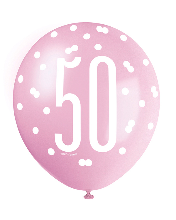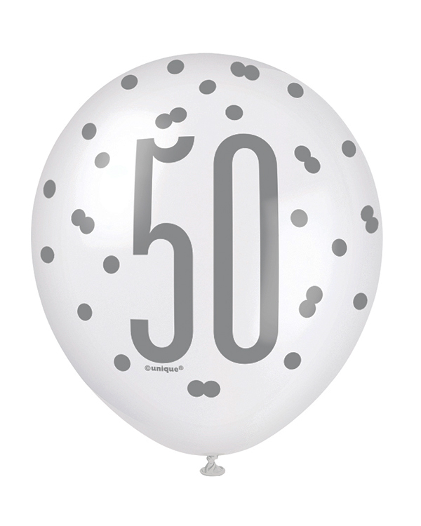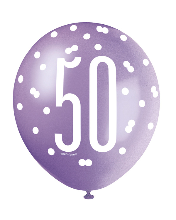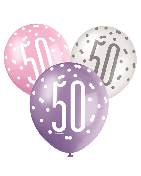 Lateksballonger (6stk): “50” – Rosa, Lilla, Hvit & Sølv – 30cm